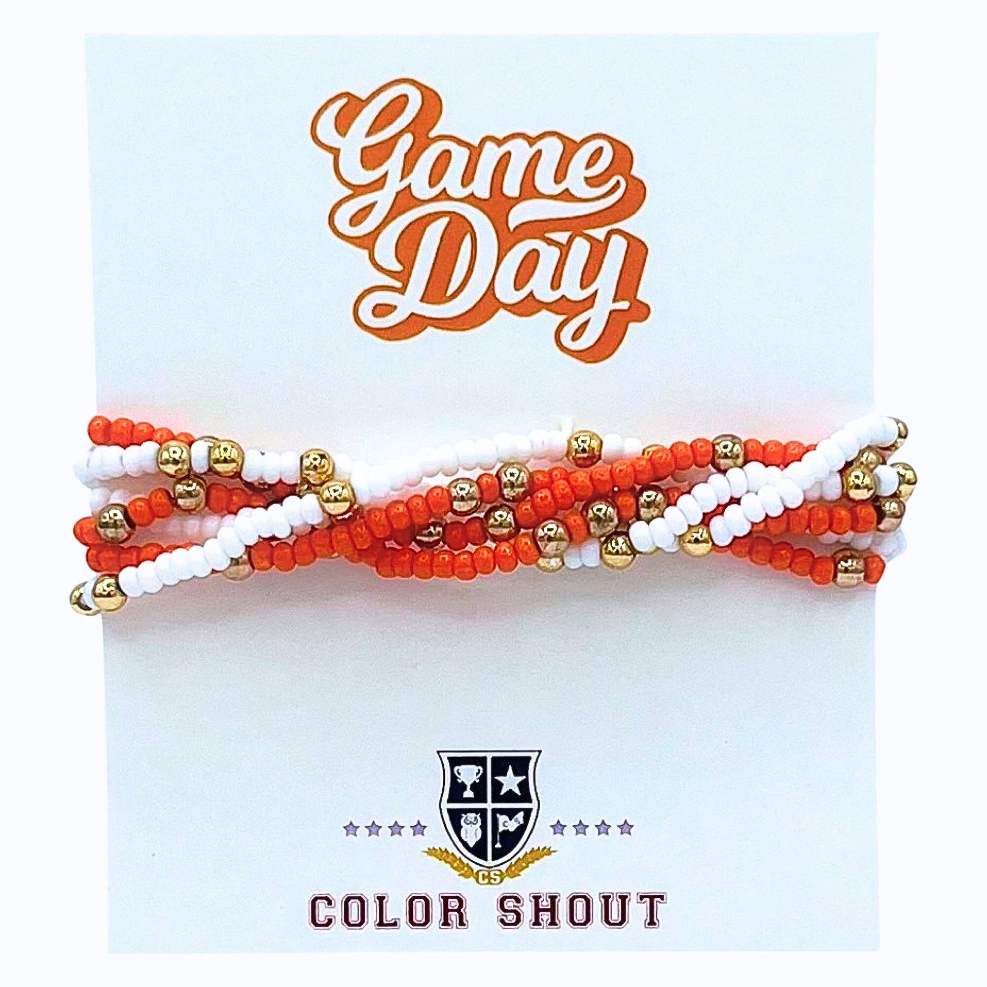 For Game Day or Every Day! Set of 6 - Colorful Glass Czech Beads and gold ball beads scattered throughout these fun stretchy bracelets offered in a rainbow of colors to show your school spirit. 6.75 inches or 17 cm on stretch cord. One size fits most. Don't see your school colors? Message us to create custom set for you.