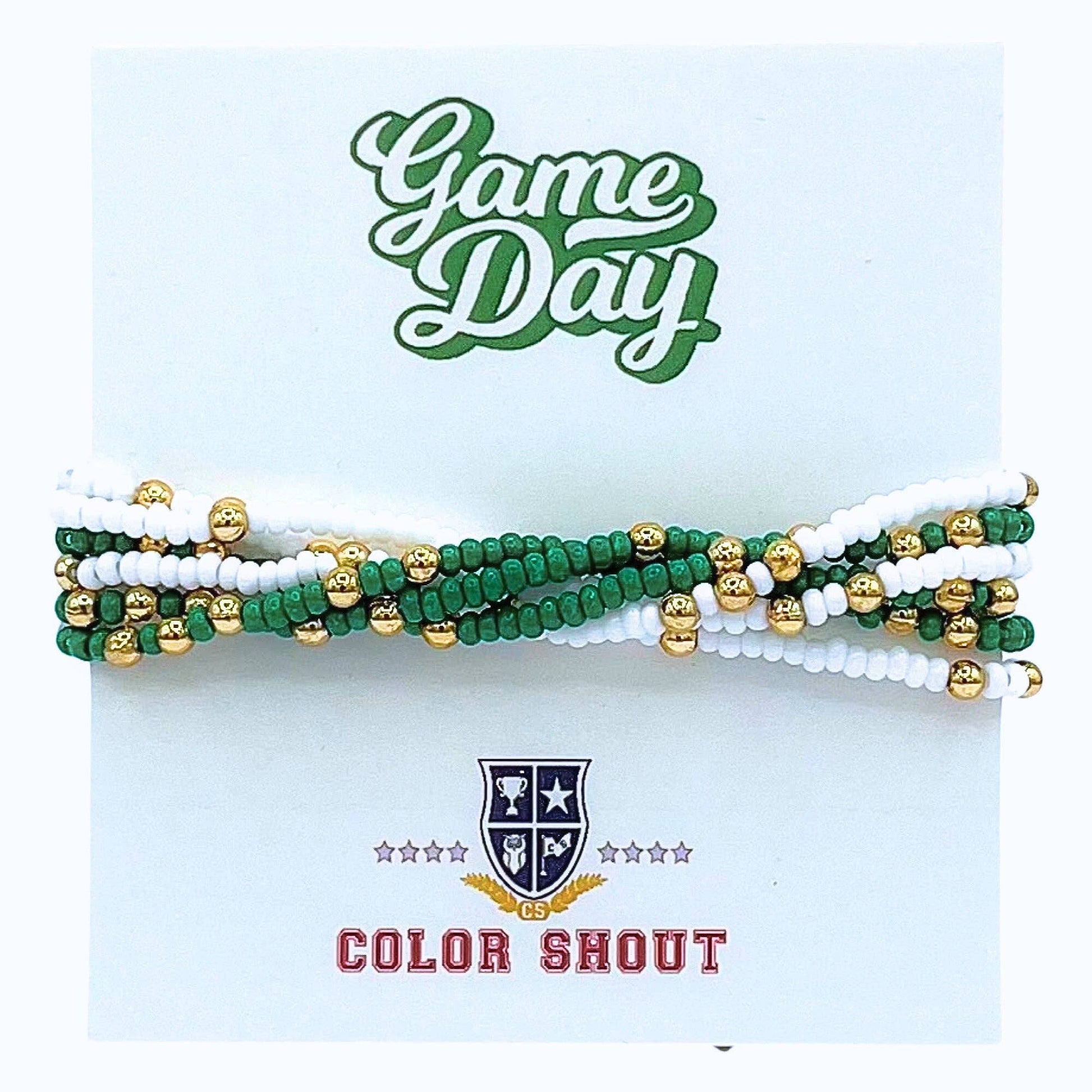 For Game Day or Every Day! Set of 6 - Colorful Glass Czech Beads and gold ball beads scattered throughout these fun stretchy bracelets offered in a rainbow of colors to show your school spirit. 6.75 inches or 17 cm on stretch cord. One size fits most. Don't see your school colors? Message us to create custom set for you.