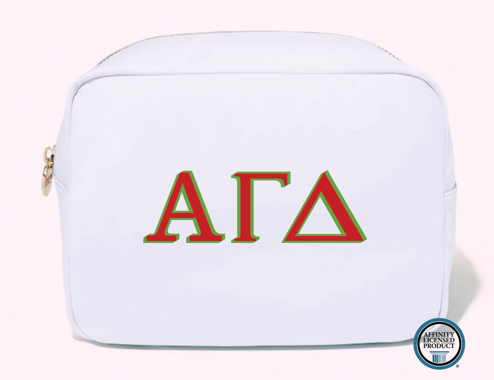 Sorority Greek Cosmetic Bag is the perfect gift for someone or a happy gift for yourself! This large zipper pouch features screen printed Greek letters for easy cleaning. Great for Skincare, accessories, jewelry + cosmetics.