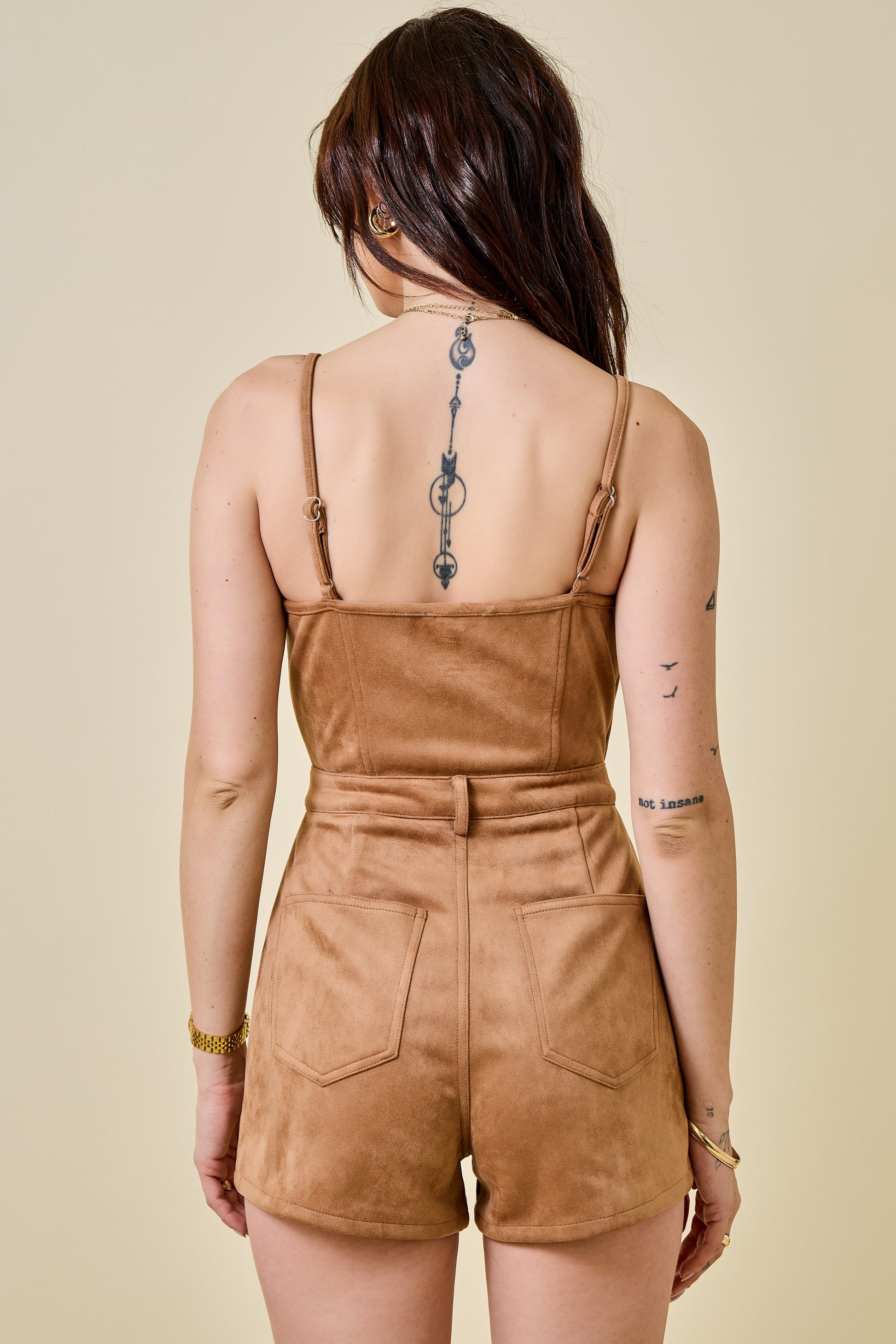 Suede Romper With Button Front And Pocket